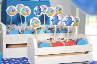 As bases para os docinhos também vinham com as tradicionais pintinhas brancas sobre o fundo azul.